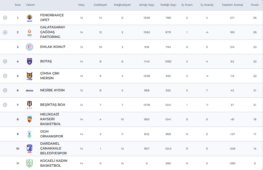Halkbank Kadınlar Basketbol Süper Ligi’nde Fenerbahçe Opet, namağlup liderliğini devam ettirdi. Çimsa ÇBK Mersin'i 79-68 yenen Galatasaray Çağdaş Faktoring maç fazlasıyla lider Fenerbahçe Opet ile puanları eşitledi. Halkbank Kadınlar Basketbol Süper Ligi’nde 15.Haftası'nda oynanan maçlardan sonra oluşan puan tablosu şu şekilde: