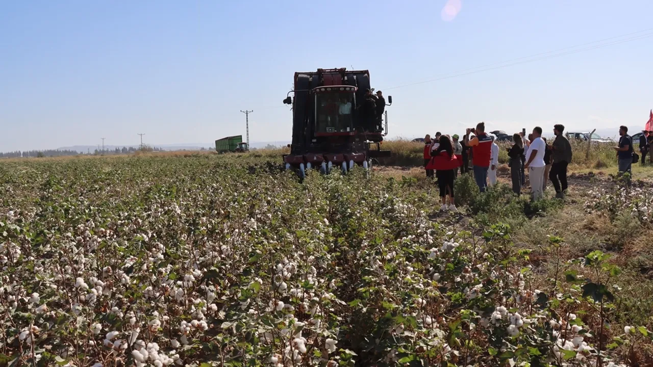 Pamuk hasat makinesine de binen Masatlı, gazetecilere yaptığı açıklamada, hasat döneminin tüm çiftçilere hayırlı olmasını diledi.