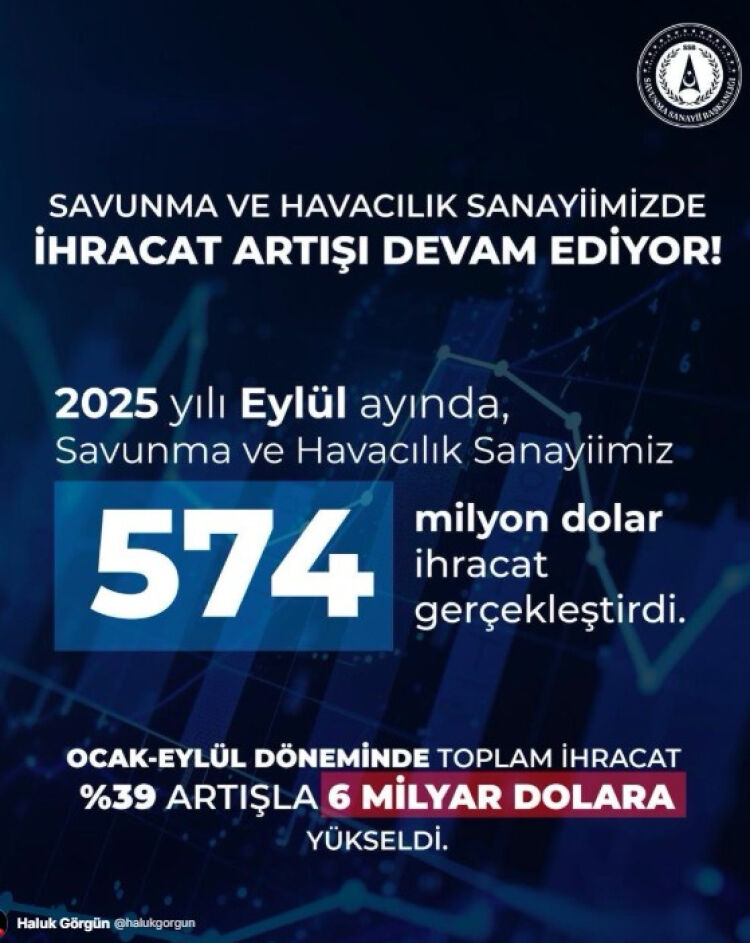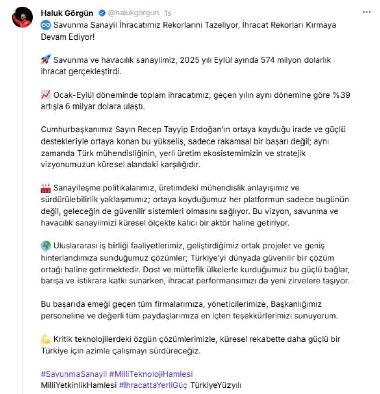 Savunma Sanayii Başkanı (SSB) Haluk Görgün, sosyal medya hesabı üzerinden yaptığı paylaşımda, savunma sanayisi ihracatının rekorlarını tazelediğini ifade ederek, "Savunma ve havacılık sanayimiz, 2025 yılı eylül ayında 574 milyon dolarlık ihracat gerçekleştirdi" dedi.