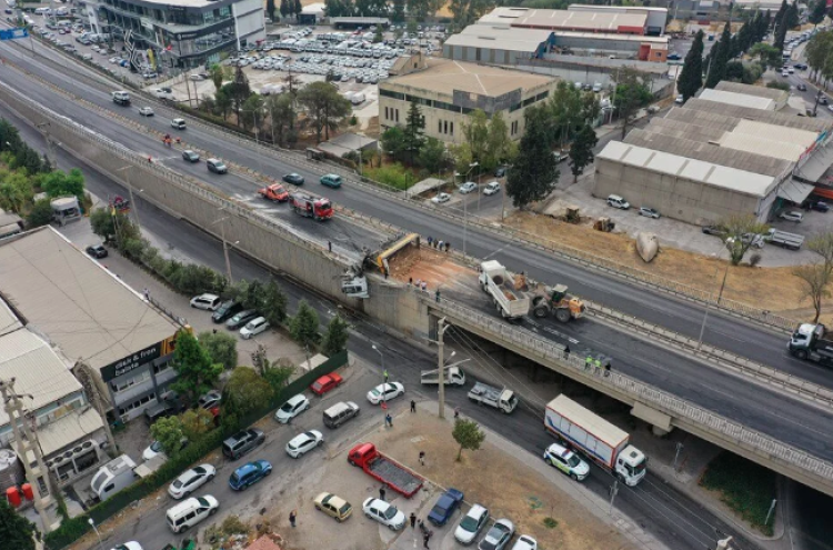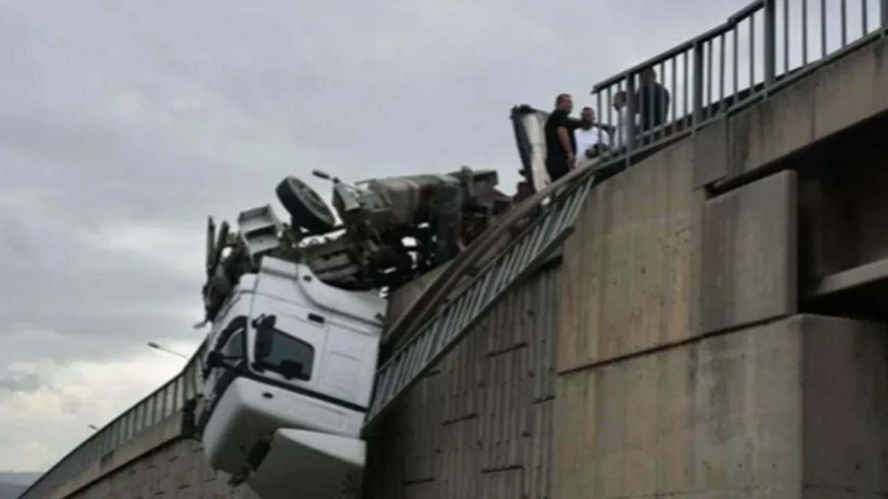 İrfan Öngen (48) idaresindeki TIR, Bornova ilçesi Ankara Caddesi 4. Sanayi Kavşağı''nda seyir halindeyken sürücüsünün kontrolünü kaybetmesi sonucu devrildi. Sürüklenen TIR, viyadükte asılı kaldı.