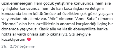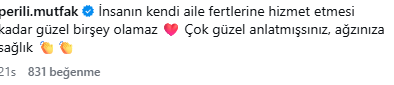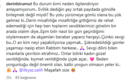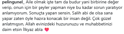 İlkyaz Salih sosyal medya hesabından yaptığı açıklamada "Aslında açık ve net çünkü bu adam sahurunu yapıyor ve uyumdan işe gidiyor,ben geri uyuyorum o işe gidiyor bu kadar basit. Hasta olsam, yorgun olsam hiçbir şekilde zaten bana sormadan kalkar alarmını kurar kalakar hazırlar beni çağırır hatta gerekirse bana yedirir yatırır bebek gibide bakar ben bu adama değil 30 gün 3 ayda sahur hazırlarım. Yemek hazırlamak, kocaya hizmet etmek,kocanın sana hizmet etmesi bunlar normal elin adamına hizmet etmiyoruz ya da eşiniz elin kadınana hizmet etmiyor. Kendi karısına kendi kocasına hizmet etmeyi biz ne zaman anormal bir durum olarak adletmeye başladık onu anlamıyorum. Ben bana teşekkür eden, yemek hazırladığımda elimi öpen, her bulduğu fırsatta bana duyduğu minnetten bahseden, beni her zaman el üstünde tutmaya çalışan bana değer veren, konuşan, düşüncelerime kıymet veren bir adama hizmet etmekten hiç gocunmam gocunmayacağımda." dedi. Yemek pişmeyen ev bana göre ev değildir diyen İlkyaz Salih sözlerine "masa kurulmayan ev bana göre ev değildir yuvayı yuva yapan bence odur. Evde bir sıcak yemeğin pişmesi bir sofra ortamının bir aile ortamının olması ancak o bana göre bir evi yuvan yapar" dedi