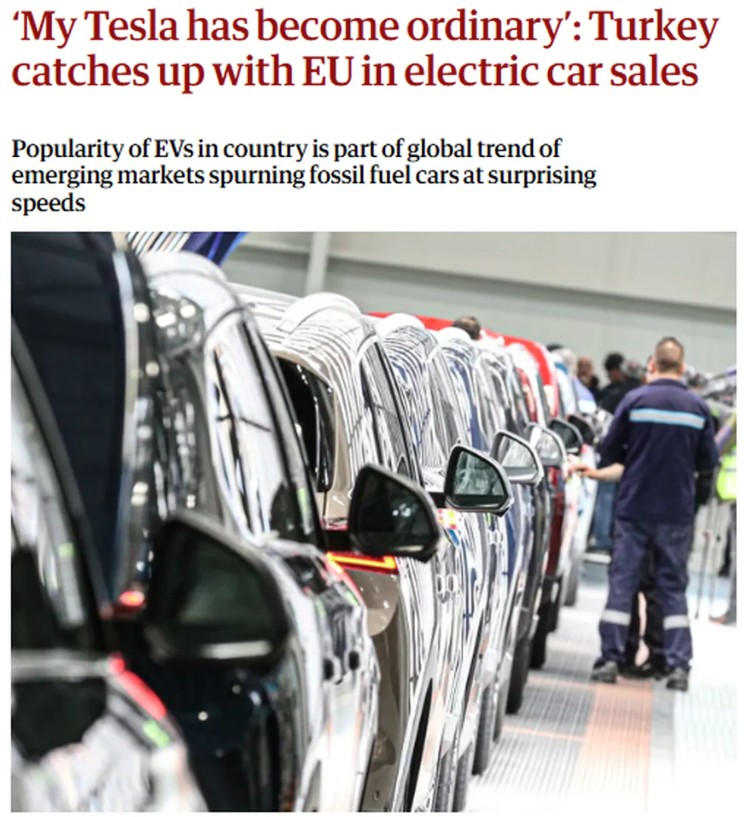 Türkiye, elektrikli otomobil pazarında gerçekleştirdiği sıçrama ile dünya basınında geniş yer buldu. İngiliz The Guardian gazetesinde yayımlanan kapsamlı analizde, Türkiye'nin Avrupa'nın en büyük dördüncü elektrikli otomobil pazarı konumuna yükselmesi "bölgesel bir liderlik örneği" olarak nitelendirildi. Yerli üretim Togg'un lokomotif görevi gördüğü bu süreçte, Türkiye'nin elektrikli araç (BEV) pazar payı Avrupa Birliği ortalamasına yaklaştı.