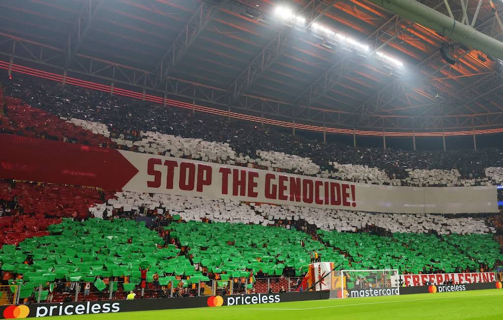 Galatasaray, Şampiyonlar Ligi’nde Bodo/Glimt’i 3-1 mağlup ederken, sahadaki galibiyet kadar tribünlerdeki anlamlı duruş da gündem oldu. Sarı-kırmızılı taraftarlar, maç öncesinde Filistin’de yaşanan insanlık dramına dikkat çekmek için nefes kesen bir koreografi sergiledi. Dev bir Filistin bayrağı açan taraftarlar, üzerine İngilizce “Stop The Genocide” (Soykırımı Durdurun) yazılı mesaj yerleştirerek dünya kamuoyuna güçlü bir çağrıda bulundu.