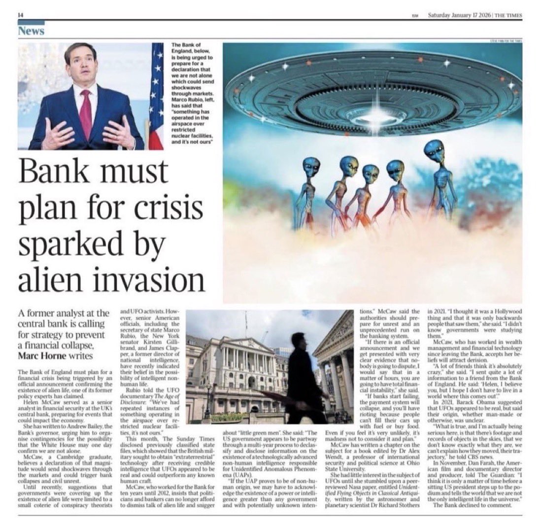 İngiltere Merkez Bankası’nın eski kıdemli analisti Helen McCaw, ABD’nin uzaylı varlığını resmen açıklaması durumunda finansal piyasaların "ontolojik şok" yaşayabileceğini savundu. McCaw, olası bir ifşanın banka iflaslarına ve küresel bir mali krize yol açabileceği konusunda uyardı.