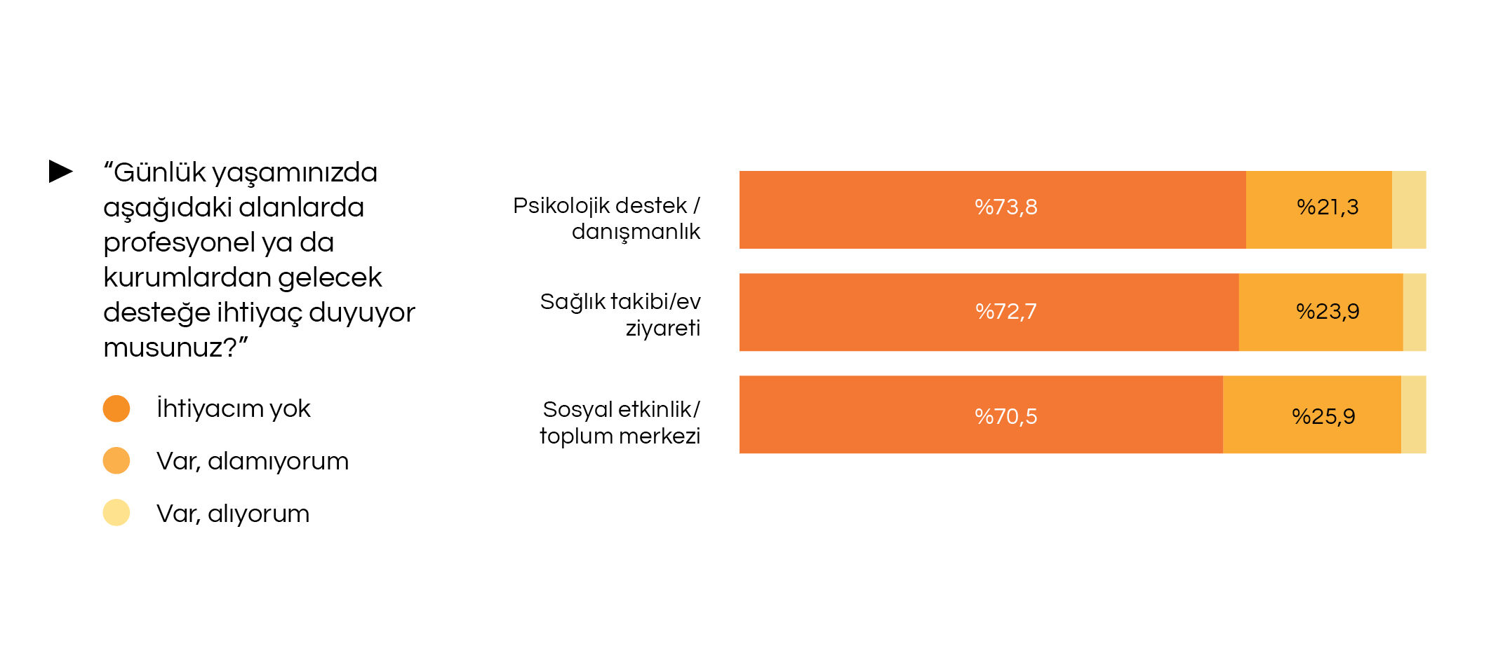 Ruh sağlığı ve psikolojik iyilik hali verileri, toplumsal cinsiyet rolleri arasındaki farkı da gözler önüne serdi. Psikolojik destek ihtiyacı duyan kadınların oranı yüzde 34,8 iken, erkeklerde bu oran yüzde 17,6’da kaldı. Bu ihtiyaca rağmen, destek alabilenlerin oranının yalnızca yüzde 4,9’da kalması, sosyal hizmetlere erişimdeki eksikliği işaret etti.