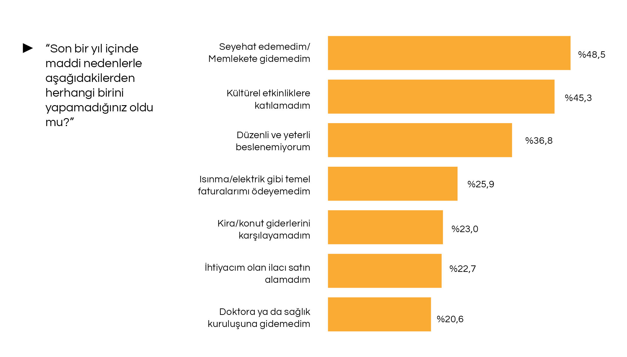 Ekonomik kırılganlık, yaş almış bireylerin hayat kalitesini temelden sarsıyor. Katılımcıların yüzde 38,2’si geçinemediğini beyan ederken, son bir yıl içinde maddi imkansızlıklar nedeniyle mahrum kalınan kalemler çarpıcı veriler sundu: