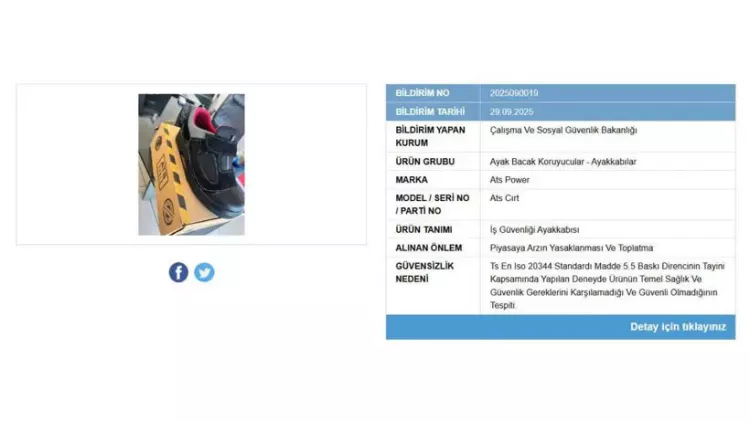 Bakanlığı paylaştığı bilgilerde ürünün TS EN ISO 20344 standardının 5.5 basınç direncine yönelik sağlık ve güvenlik kriterlerini karşılayamadı. Koruma sağlaması gereken ürün işçi sağlığı açısından ciddi riskler taşıdığı ortaya çıktı. İşçiler için yanık ve yaralanma riski oluşturduğu tespit edildi.