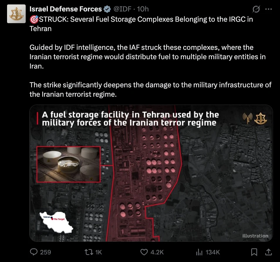 İsrail ordusu, savaşın başlangıcından bu yana ilk kez Tahran’ın kuzeybatısında bulunan devasa bir petrol deposunu vurduğunu teyit etti.
