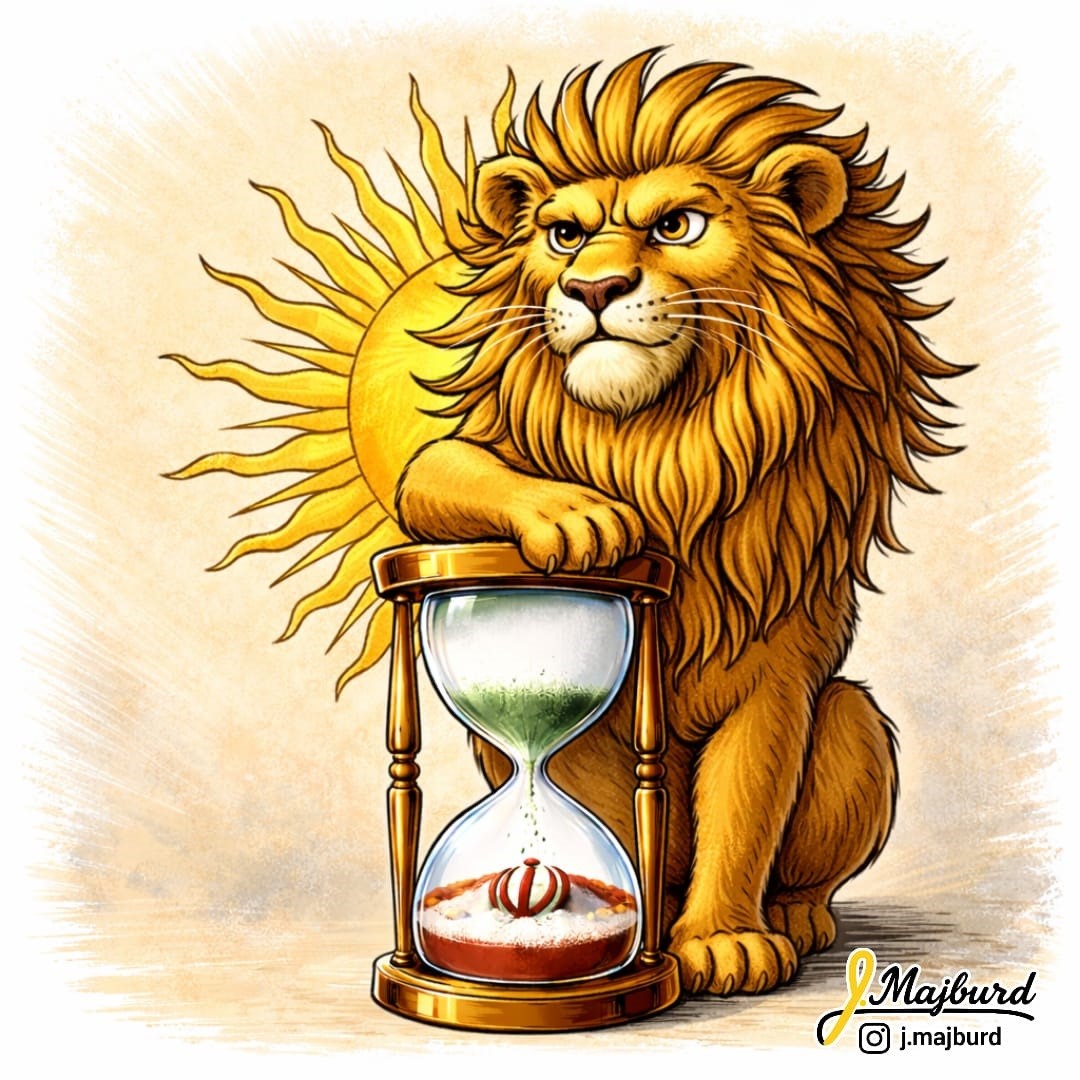 Bir diğer gönderide ise 1979 yılındaki devrim öncesinde kullanılan aslan ve güneş figürlü eski İran bayrağına atıf yapıldı. Karikatürde, aslan pençesinin bir kum saatini ezdiği görülürken, mevcut yönetim sisteminin vaktinin dolduğu imasında bulunuldu.