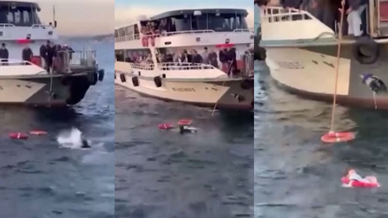 Suya atlayan kişi, kadın yolcuyu yakaladı. Ardından can simidi takılan yolcu bir tekneye çıkarıldı.