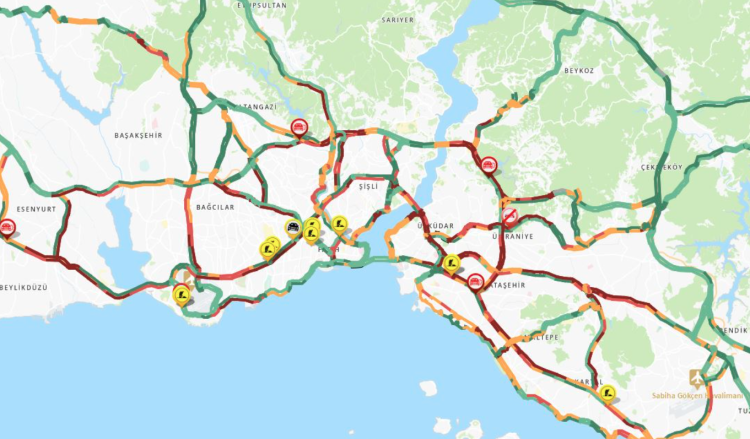 İBB Cep Trafik haritası verilerine göre trafik yoğunluğu, Avrupa Yakası''nda yüzde 80, Anadolu Yakası''nda ise yüzde 90''a kadar ulaştı.