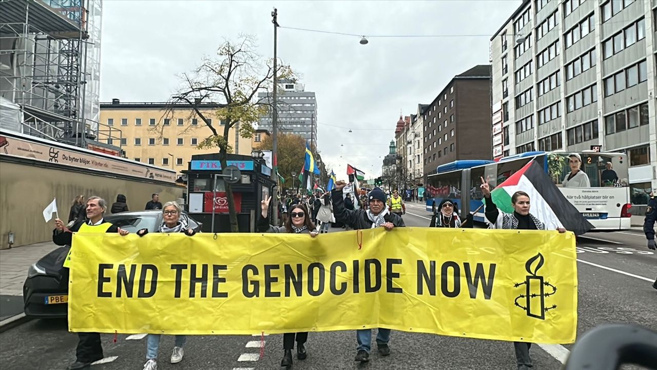 Eylemde, "Gazze'de çocuklar öldürülüyor", "Soykırımı durdurun" ve "Sonsuza kadar Filistin" yazılı pankartlar taşıyan göstericiler İsveç Parlamentosu'na yürüdü.