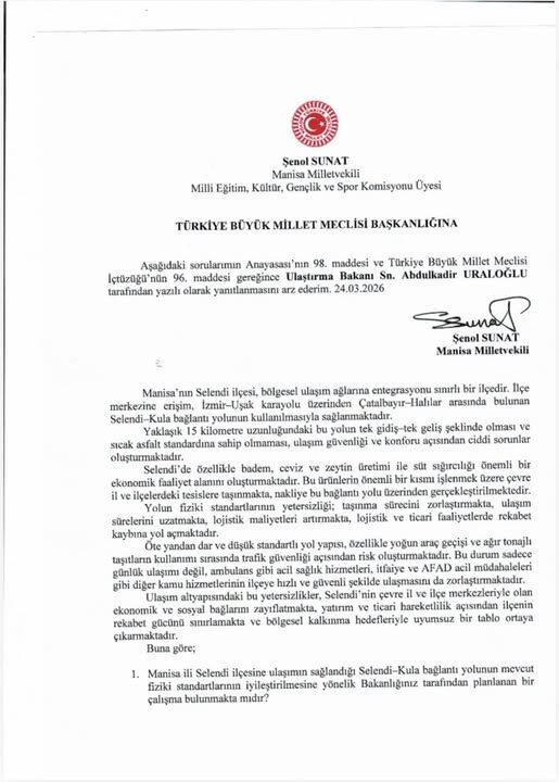Sunat, Ulaştırma ve Altyapı Bakanı Abdulkadir Uraloğlu’na yönelttiği soru önergesinde, “Bu yol ne zaman yapılacak?” ifadelerini kullandı. Selendi-Kula arasındaki yaklaşık 15 kilometrelik yolun standartların altında olduğunu belirten Sunat, bu durumun hem ekonomik hem de güvenlik açısından ciddi sorunlara yol açtığını vurguladı.