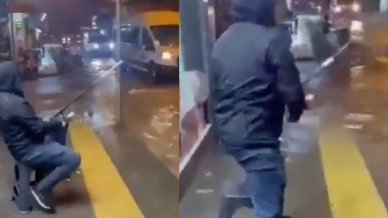 İzmir'de bir vatandaşın, göle dönen yolda oltayı alarak balık tuttuğu görüldü.