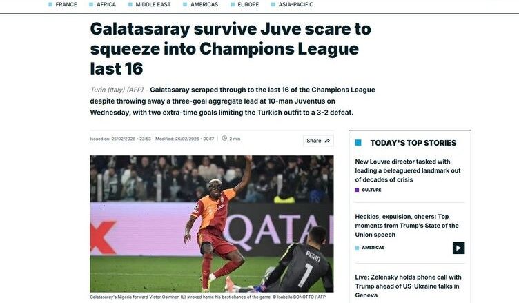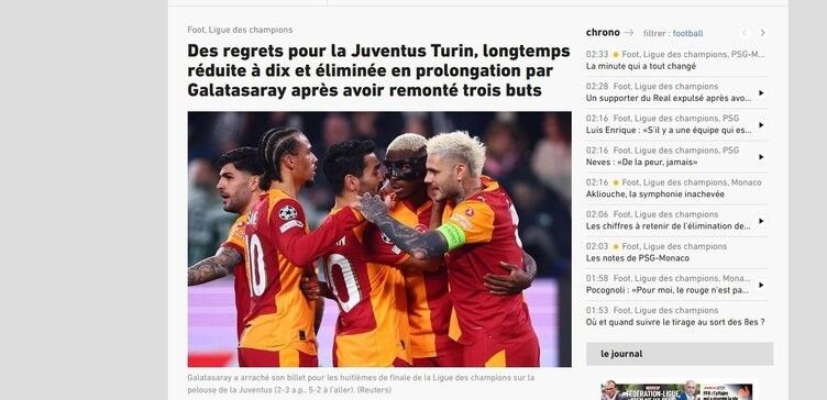France24: ''Galatasaray, Juve kabusunda hayatta kaldı ve Şampiyonlar Ligi'nde son 16'ya yükseldi.''