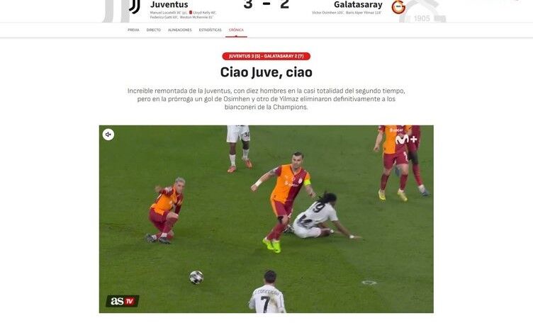 AS: ''Juventus geri döndü, ikinci yarının neredeyse tamamını 10 kişi oynadı ama uzatmalarda Osimhen ve Barış Alper'in golleri siyah beyazlıları Şampiyonlar Ligi'nden eledi.''