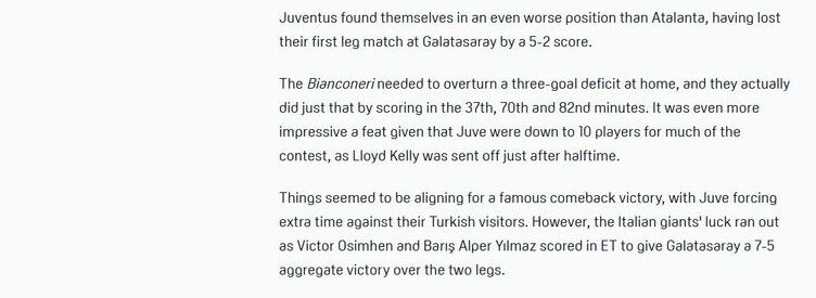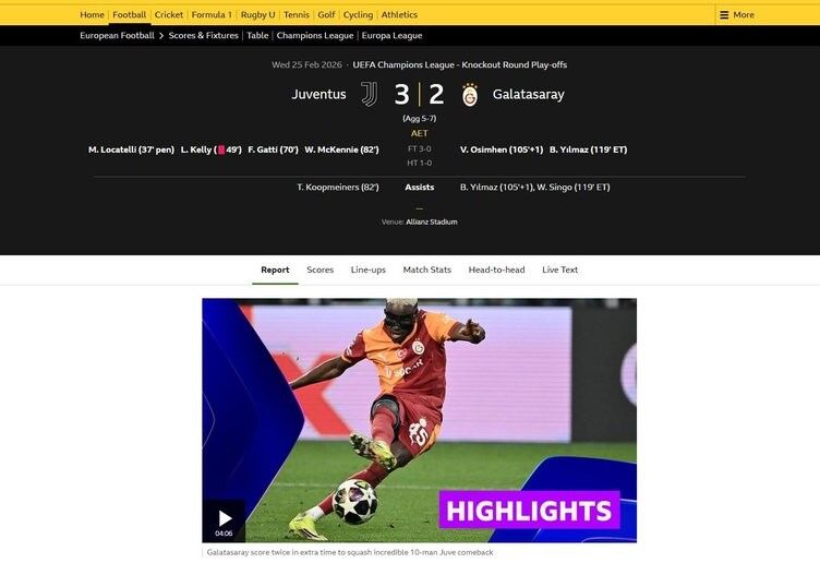 BBC Sport: ''Osimhen ve Barış uzatmalarda gol attı, Galatasaray, 10 kişilik Juventus'un büyüleyici geri dönüşüne engel oldu ve Şampiyonlar Ligi'nde son 16'ya yükseldi.''
