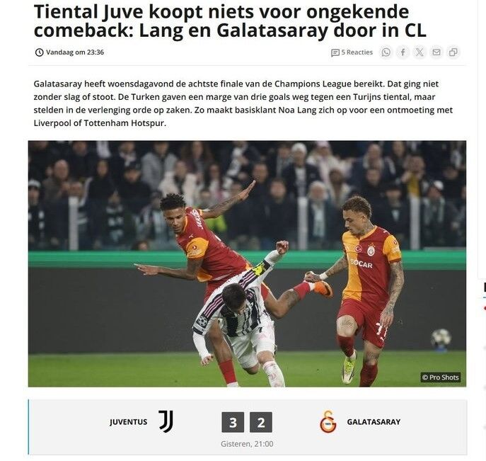 vi.nl : ''On kişi kalan Juventus'un olağanüstü geri dönüşü sonuç vermedi; Noa Lang ve Galatasaray, Şampiyonlar Ligi'nde tur atladı.''