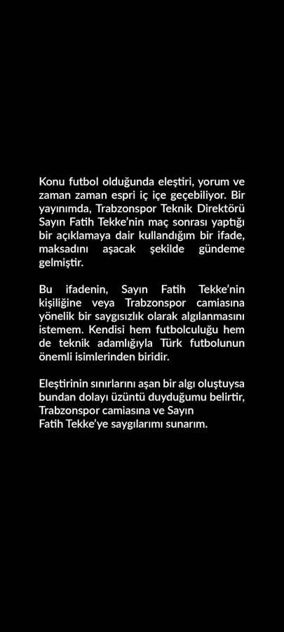 “Konu futbol olduğunda eleştiri, yorum ve zaman zaman espri iç içe geçebiliyor. Bir yayınımda, Trabzonspor Teknik Direktörü Sayın Fatih Tekke’nin maç sonrası yaptığı bir açıklamaya dair kullandığım bir ifade, maksadını aşacak şekilde gündeme gelmiştir.