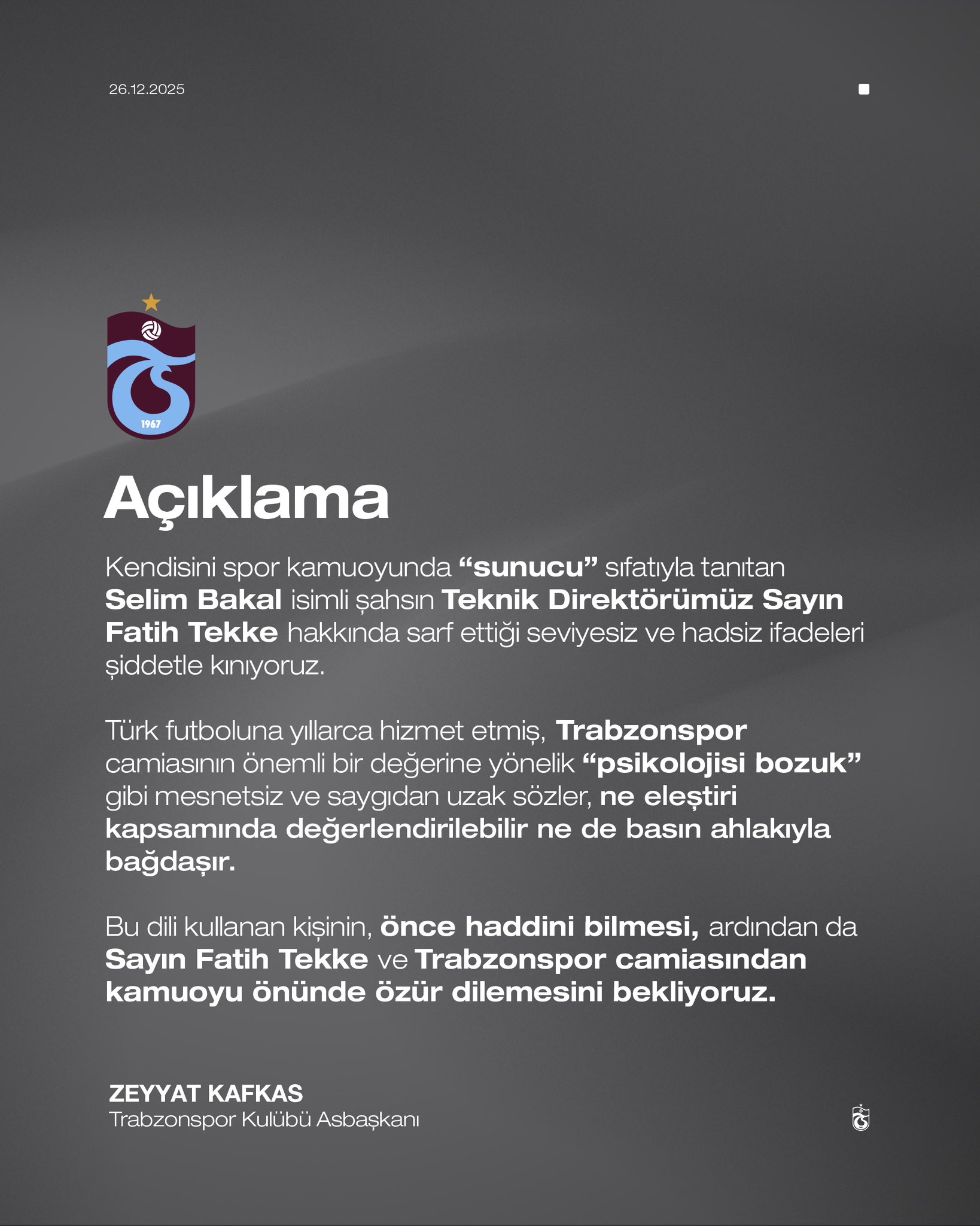 Sunucu Bakal’ın sözleri üzerine Trabzonspor Kulübü bir açıklama yaptı. Asbaşkan Zeyyat Kafkas tarafından yapılan açıklamada şu ifadelere yer verildi: