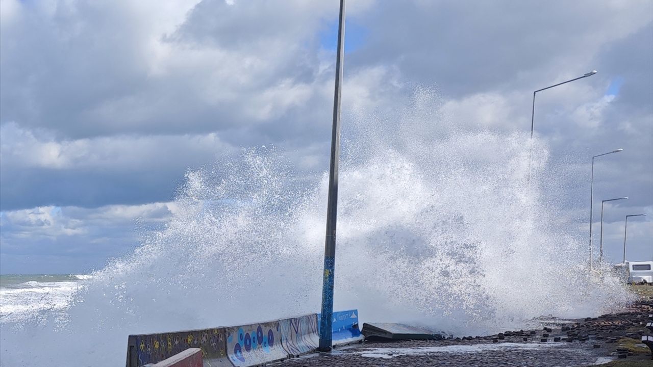 Kuvvetli rüzgarın etkisiyle boyu metreleri bulan dalgalar, sahil bandını dövdü. Dalgaların şiddetiyle: