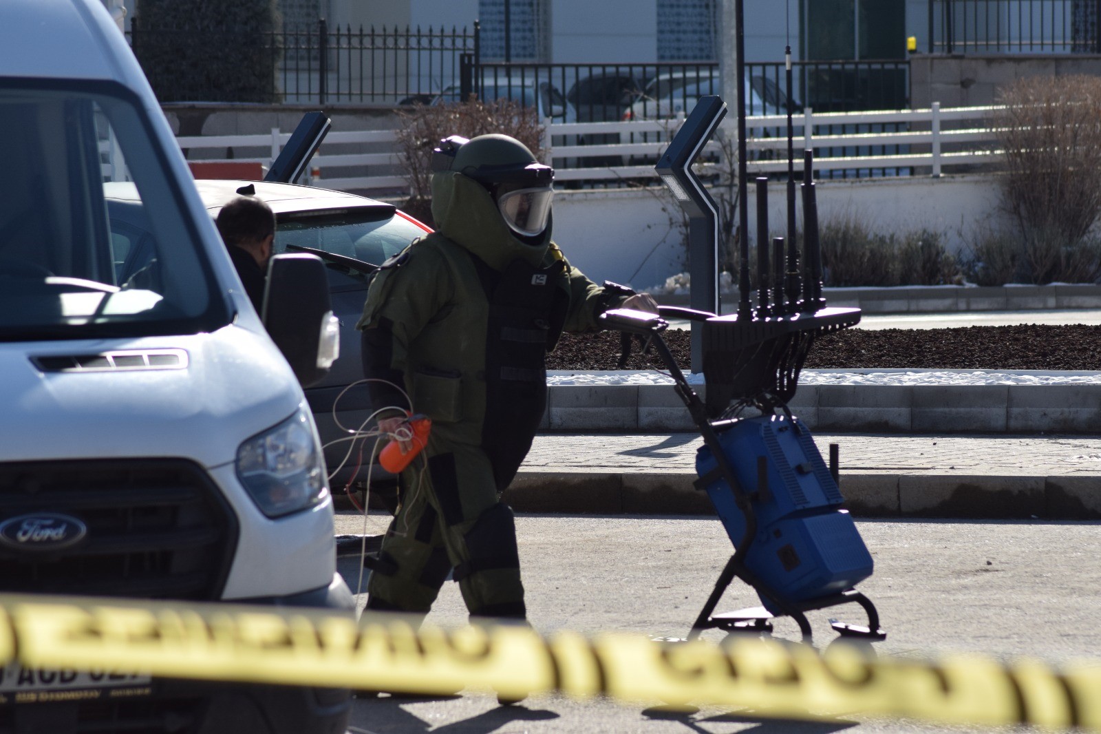 Bölge halkını uzaklaştıran ekipler, adliyeye çıkan cadde ve sokakları da trafiğe kapattı. Ardından çağrılan bomba imha uzmanı, özel kıyafetini giyerek valizi inceledi ve fünye yerleştirdi.