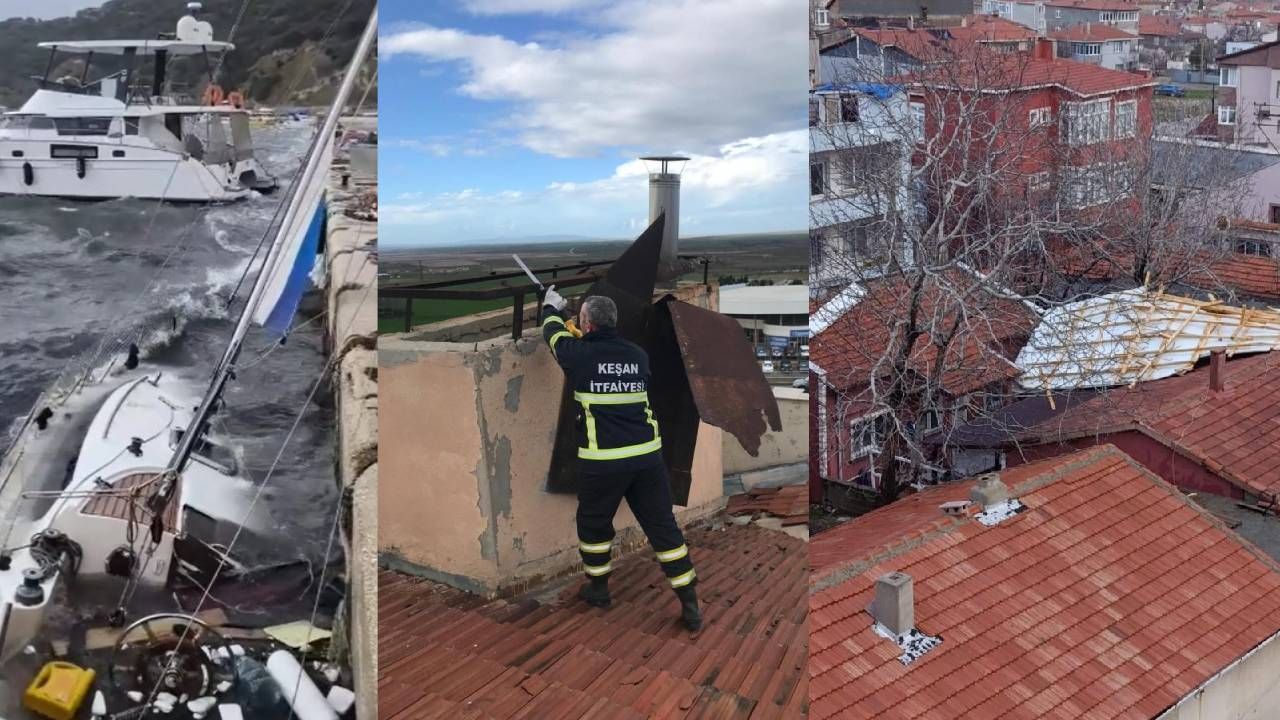 Meteoroloji'nin kuvvetli yağış ve rüzgar uyarısının peşinden, Keşan ilçe genelinde de esen şiddetli rüzgar hayatı olumsuz etkiledi. İlçe merkezindeki bazı apartmanların çatıları uçtu. Keşan İtfaiye Müdürlüğü ekipleri, çatılarda kopmak üzere olan ve tehlikeye yol açacak malzemeleri sökerek aşağı indirdi.