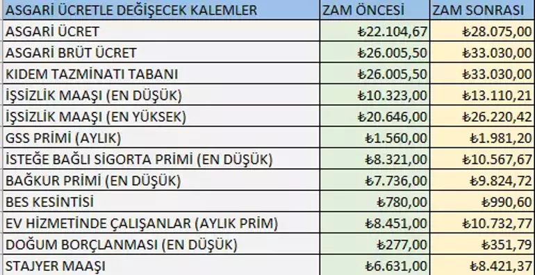 Asgari ücrete yeni yılda yapılan zamla birlikte işsizlik maaşı, Genel Sağlık Sigortası (GSS) primi, isteğe bağlı sigorta primi, BAĞ-KUR primi, Bireysel Emeklilik kesintisi, ev hizmetinde çalışanların primleri, doğum, askerlik, borçlanması gibi ödeme ve ücretler de değişti.