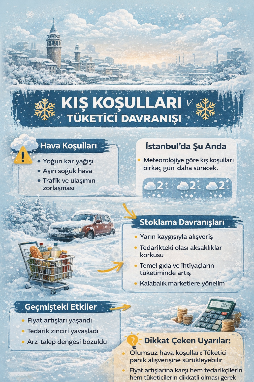 İstanbul’da kış koşullarının sertleşmesiyle birlikte market alışverişlerinde gözle görülür bir hareketlilik yaşanıyor. Kar yağışı ve soğuk hava uyarıları, birçok yurttaşı alışverişini öne çekmeye ve temel gıda ürünlerinde stok yapmaya yönlendirirken, bu eğilimin arkasında fiyat artışından çok erişim endişesi öne çıkıyor. Uzmanlara göre “yarın bulamam” düşüncesi, soğuk havanın tüketici davranışı üzerindeki en belirgin etkisi olarak dikkat çekiyor.