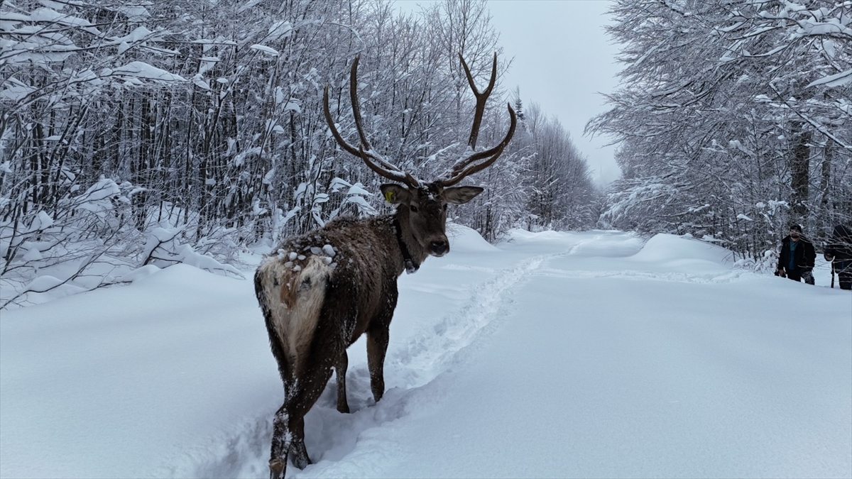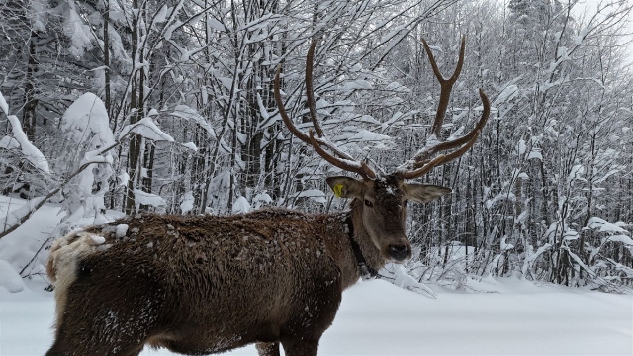 Bu kapsamda, Samanlı Dağları'nın 1640 rakımlı zirvesinde bulunan geyiklerden biri, karla kaplı yaylada dronla görüntülendi. Görüntülerde, karla kaplanan yaylada gezen kızıl geyiğin farklı kesitleri yer aldı.