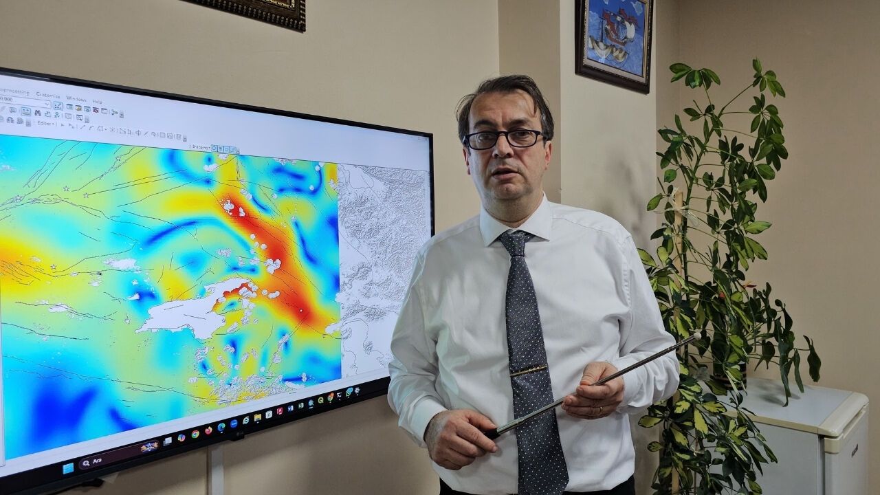 "Burada baktığımız zaman şu kırmızı bölge homojen bir şekilde yüksek gerilim bölgesini elde ediyor, gerginlik bölgesini. Her yıl bu gerginlik üst üste koyuluyor ve devam ediyor. Çaldıran fayı burada kırılmış ama burada hiçbir büyük deprem kaydı olmayan kocaman bir alan söz konusu. Bu alanın uzunluğu yukarıdan aşağıya kadar 250 km ve bunların homojen bir şekilde kırmızı renkte görünmesi bu sistemin birlikte çalıştığını gösteriyor. Birlikte çalışması da şu anlama geliyor. Biraz korkutucu olacak ama bu 6 Şubat 2023'te Hatay'da görmüş olduğumuz gibi 250 kilometrenin aynı anda çalışması da ihtimal dahilinde bir durum. Buradaki harita bölgenin eşit oranda gerildiğini gösteriyor. Homojen bir gerginlik söz konusu. Biz sürekli tabii nüfusun büyük bir bölümü batıda yaşadığı için sürekli batıdaki faaliyetler üzerinde konuşuluyor ama bizim Türkiye geneli üzerinde yaptığımız çalışmalar bu bölgenin en fazla gelinen bölgelerden bir tanesi olduğunu gösteriyor. Bu bölgeye de dikkat etmek ve gereken tedbirleri almak gerekiyor."