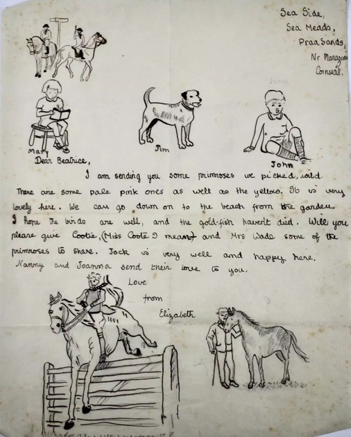 1936-1940 yılları arasında Cornwall'da bulunduğu sırada yazılan tek sayfalık metinde, geleceğin kraliçesi köpeklerin ve atların durumunu merak ederken; kuşların iyi olup olmadığını ve akvaryumdaki balıkların hayatta kalıp kalmadığını soruyor. Kendi elleriyle yaptığı çizimlerle süslediği mektupta, topladığı çuha çiçeklerinin saray personeli arasında paylaşılmasını istemesi ise çocuksu nezaketini gözler önüne seriyor.