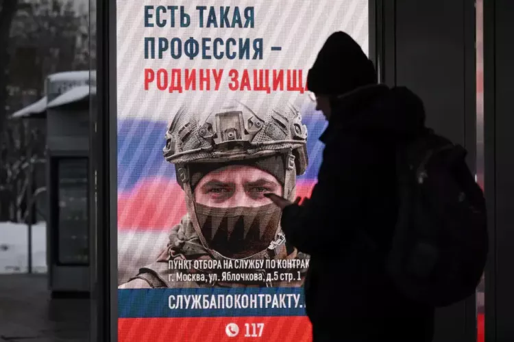 *Rus ordusunda sözleşmeli askerliği tanıtan ve “Vatan savunması diye bir meslek vardır” ifadesi yer alan bir reklam ekranı. *AFP
