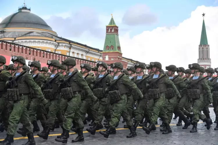*Rus askerler, 2022''de Moskova''daki Zafer Günü askeri geçit töreni sırasında Kızıl Meydan''da yürüyor. *AFP