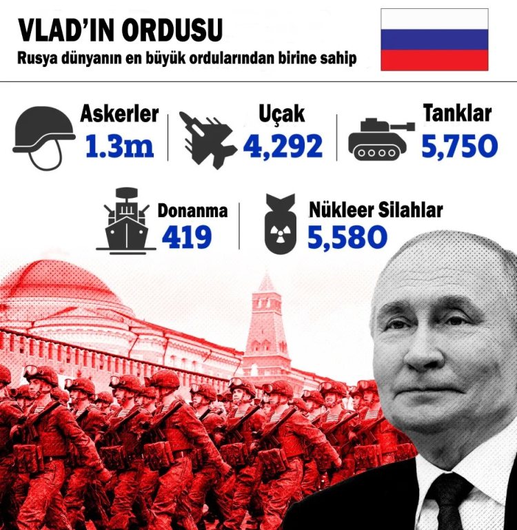 Batılı kaynaklara göre, 2022’de başlayan Ukrayna işgalinde Rusya bir milyondan fazla askerini kaybetti. Putin, asker sayısını 1,5 milyona çıkarmak için askerlik süresini artırırken, askeri harcamaları Sovyetler Birliği dönemindeki en yüksek seviyelere taşıdı. Kremlin, güçlü propaganda yapmasına rağmen savaşta yakın zafer görünmüyor.