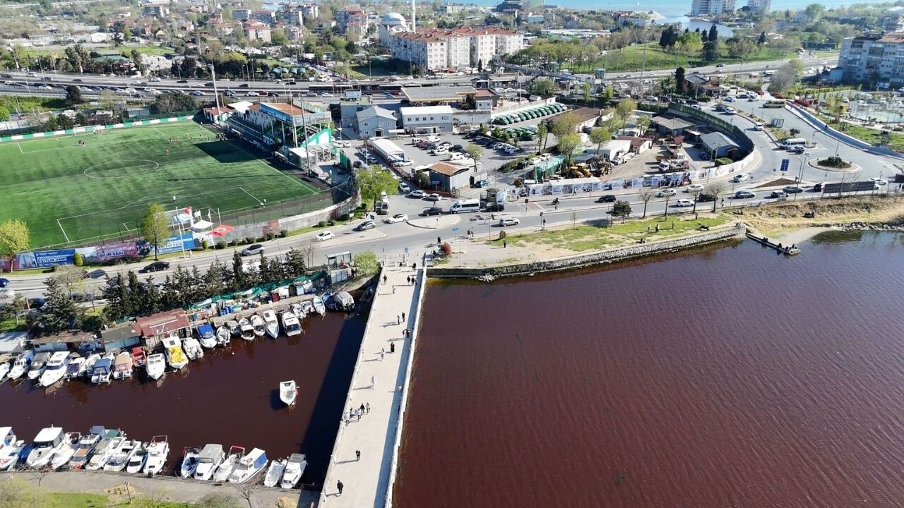 İstanbul'daki Küçükçekmece Gölü renk değiştirdi. Gölün, denizle buluştuğu alanda su kırmızıya dönerken, yaşanan renk değişimi dron ile görüntülendi.