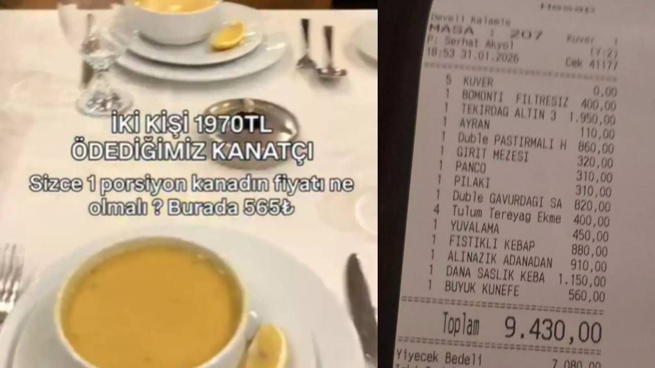 İstanbul Kartal'da bir restoranda yediği tavuk kanadın faturasıyla ilgili yapılan paylaşım gündem oldu. Paylaşımda belirtilene göre içerik üreticisi, tavuk kanada 1.130 TL, toplam hesap tutarına ise 1.970 TL ödediğini dile getirdi. Siparişte yalnızca 2 porsiyon çorba, 2 porsiyon kanat ve 1 porsiyon salatanın yer aldığı görüldü.
