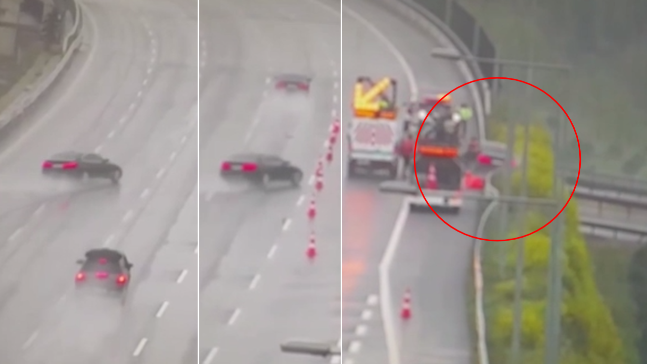 Güvenlik kamerasına yansıyan görüntülerde, 4 şeritli yolun en sol şeridinde seyir halindeki otomobilin sürücüsünün hakimiyetini kaybetmesi sonucu tüm şeritleri geçerek yolun sağındaki çelik bariyere vurduktan sonra otomobilin savrulması ve yolda bulunan çalışanlara çarpması yer alıyor.