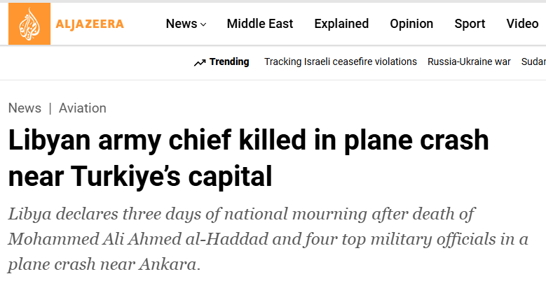 AL JAZEERA: “LİBYA GENELKURMAY BAŞKANI ANKARA’DAN DÖNÜŞTE HAYATINI KAYBETTİ”