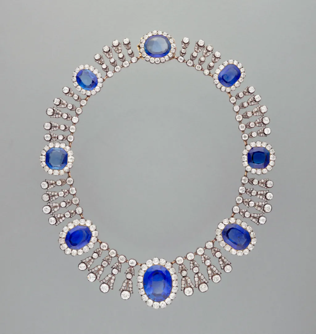 Kraliçe Marie-Amelie ve Kraliçe Hortense’a ait safir setinden bir taç, kolye ve tek küpe