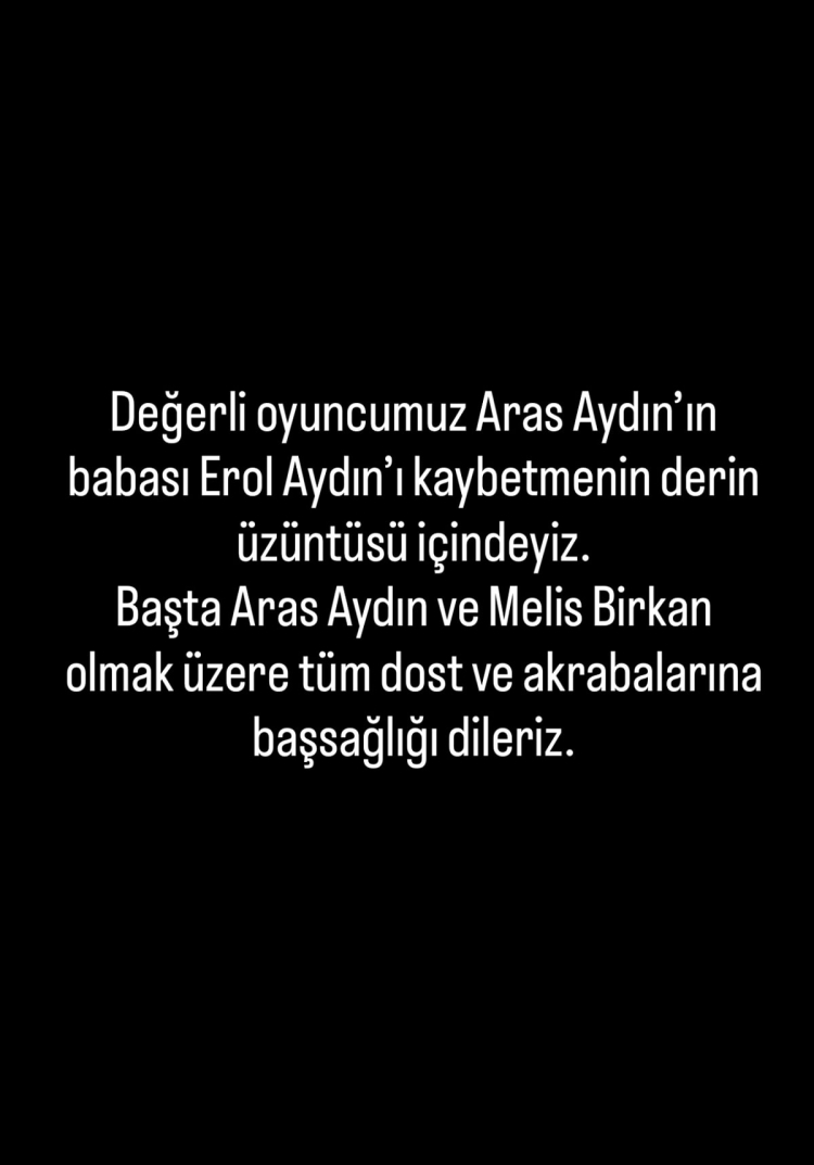 Aras Aydın''ın menajeri tarafından yapılan açıklamada; "Değerli oyuncumuz Aras Aydın, babası Erol Aydın''ı kaybetmenin derin acısı içindedir. Başta Aras Aydın ve Melis Birkan olmak üzere, tüm dost ve yakınlarına başsağlığı diliyoruz" ifadelerine yer verildi.