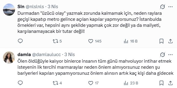 Marmaray’da yaşanan olayların ardından sosyal medyada da yoğun bir tartışma başladı. Kullanıcılar, özellikle metro sistemlerinde uygulanan güvenlik önlemlerinin artırılması gerektiğine dikkat çekti. Platform kapıları gibi önleyici sistemlerin İstanbul’da da yaygınlaştırılması gerektiğini savunan paylaşımlar öne çıkarken, bazı kullanıcılar bu tür çözümlerin hem uygulanabilir hem de maliyet açısından karşılanabilir olduğunu dile getirdi.