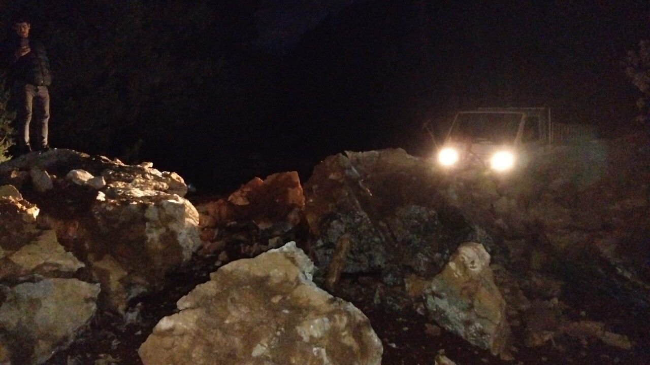 Yağışların etkisiyle dağdan kopan dev kayalar, toprak yolu tamamen kapatarak geçişi engelledi. Yoldan geçmek isteyen vatandaşlar durumu cep telefonu kamerası ile kayıt altına aldı.