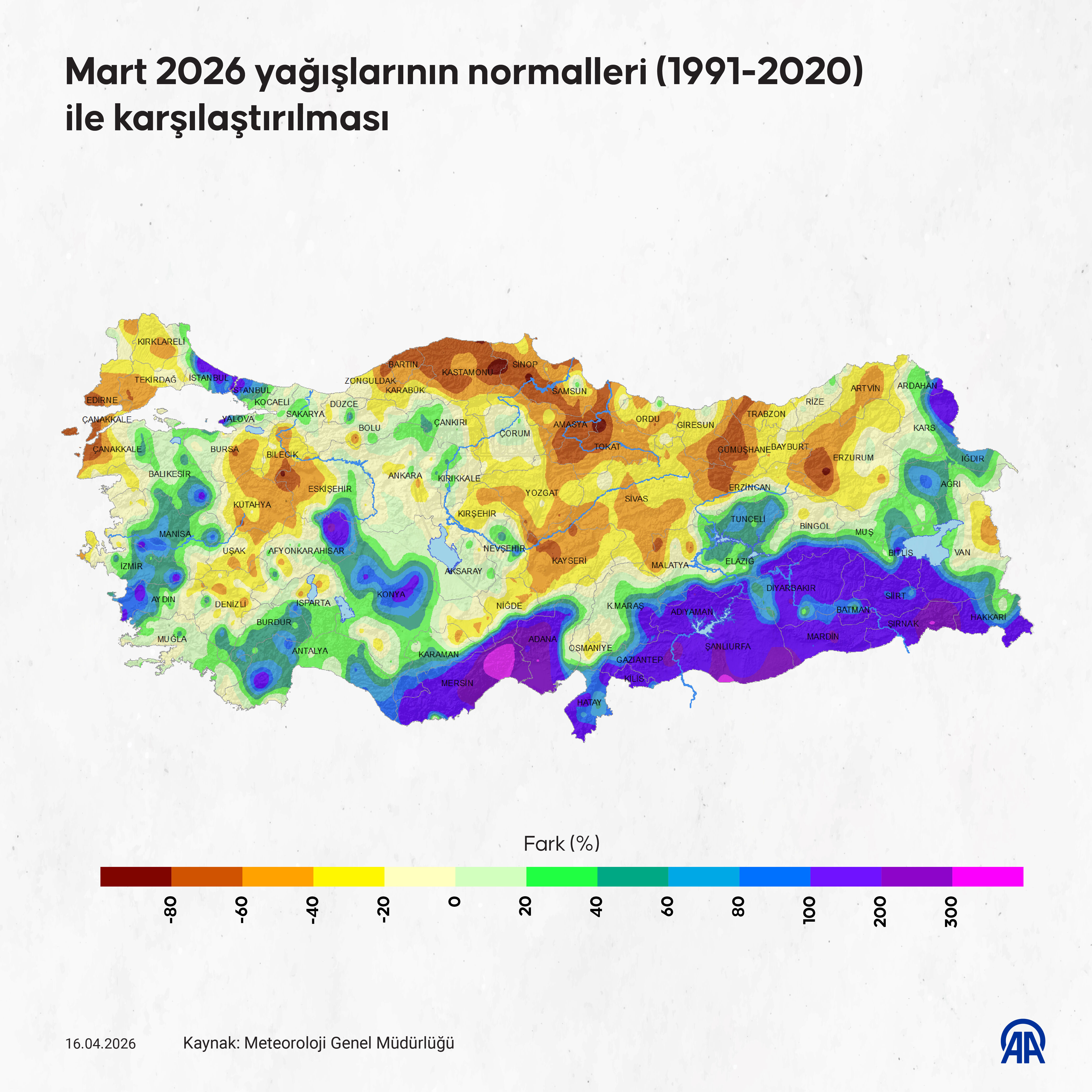 Mart ayı yağışları Siirt'te 66, Mersin, Adana, Diyarbakır, Gaziantep, Kilis ve Mardin'de son 30 yılın en yüksek seviyesine ulaştı. Sinop'ta son 40, Bartın'da son 37, Tokat'ta son 36, Gümüşhane ve Samsun'da ise son 33 yılın en düşük yağış seviyeleri kaydedildi.