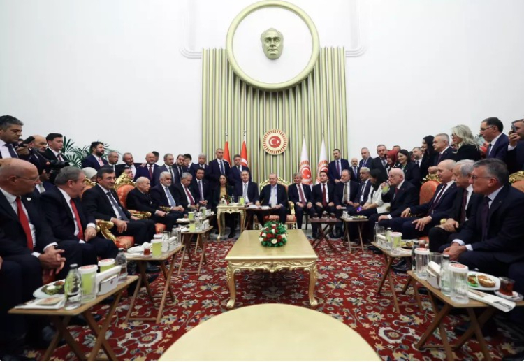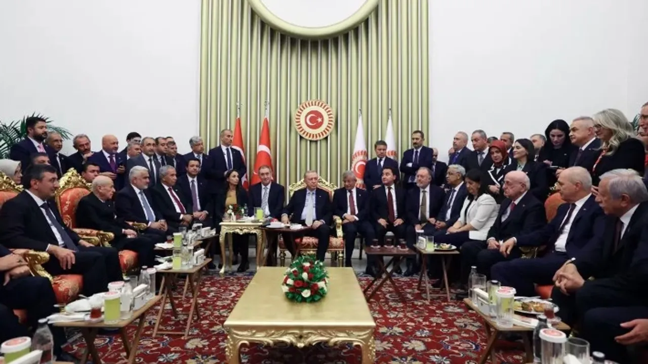 Meclis''teki Tören Salonu''nda verilen resepsiyonda Erdoğan ile TBMM Başkanı Numan Kurtulmuş, MHP Genel Başkanı Devlet Bahçeli, HÜDA PAR Genel Başkanı Zekeriya Yapıcıoğlu, Yeniden Refah Partisi Genel Başkanı Fatih Erbakan, DEVA Partisi Genel Başkanı Ali Babacan, Gelecek Partisi Genel Başkanı Ahmet Davutoğlu, DEM Parti Eş Genel Başkanları Tülay Hatimoğulları ve Tuncer Bakırhan, Saadet Partisi Genel Başkanı Mahmut Arıkan ve BBP Genel Başkanı Mustafa Destici bir araya gelmişti.