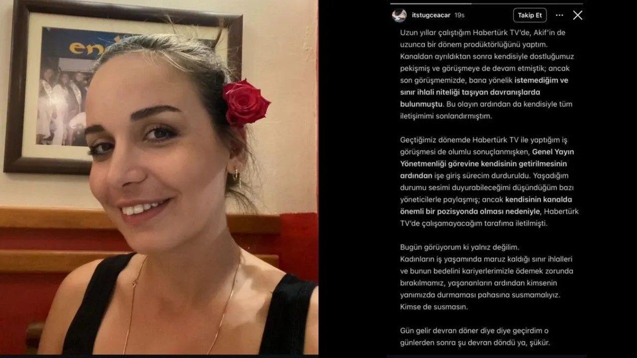 “Uzun yıllar çalıştığım Habertürk TV'de, Akif'in de uzunca bir dönem prodüktörlüğünü yaptım. Kanaldan ayrıldıktan sonra kendisiyle dostluğumuz pekişmiş ve görüşmeye de devam etmiştik; ancak son görüşmemizde, bana yönelik istemediğim ve sınır ihlali niteliği taşıyan davranışlarda bulunmuştu. Bu olayın ardından da kendisiyle tüm iletişimimi sonlandırmıştım.