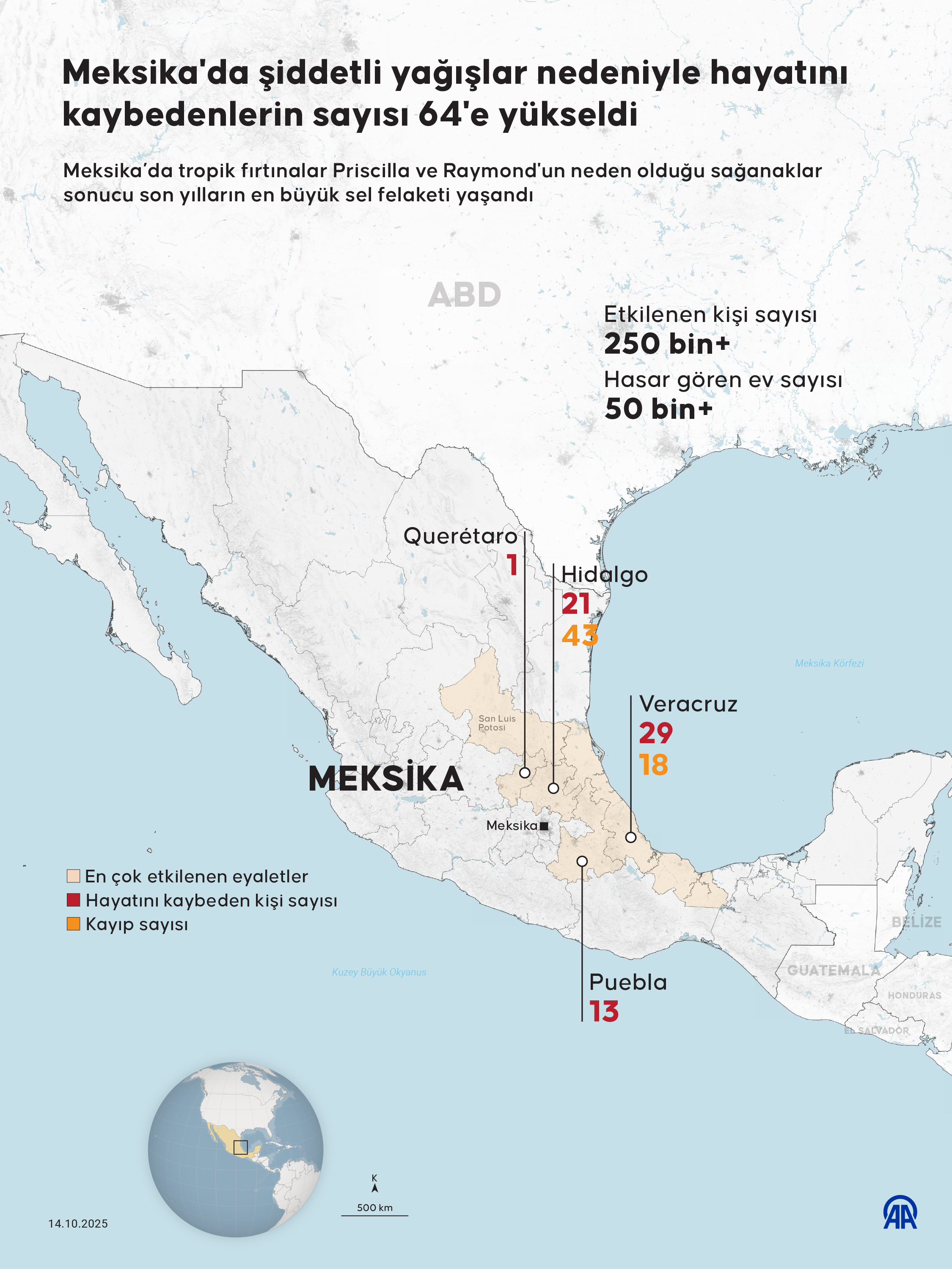 Sivil Koruma Ulusal Koordinatörlüğü (CNPC), tropik fırtınalar Priscilla ve Raymond’un geçen haftadan bu yana ülkenin doğu ve orta kesimlerinde aşırı yağışlara neden olduğunu açıkladı. En fazla zararın Veracruz, Puebla, Hidalgo, Queretaro ve San Luis Potosi eyaletlerinde meydana geldiği, birçok yerleşim yerinin sular altında kaldığı bildirildi.