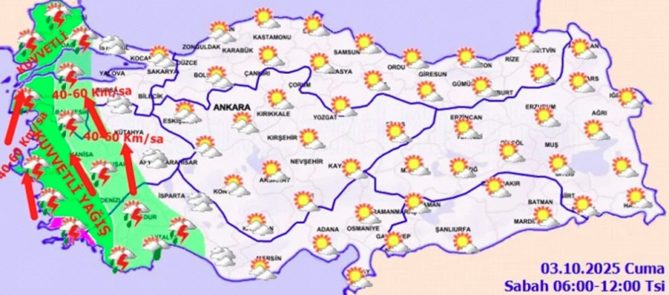 Meteoroloji Genel Müdürlüğü''nün verilerine göre Marmara''nın batısı ile Ege''de kuvvetli, Muğla kıyılarında çok kuvvetli sağanak yağış bekleniyor.