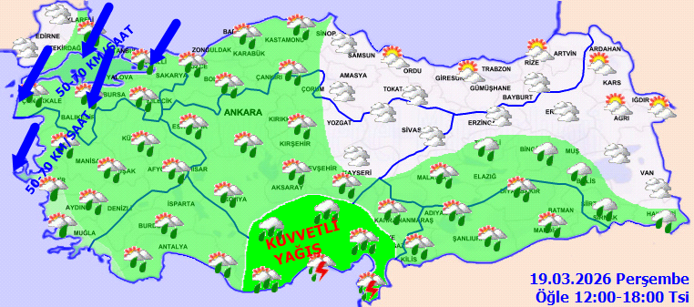 Not: Yağışlar kıyı kesimlerde sağanak ve gök gürültülü sağanak, iç ve doğu kesimlerde ise karla karışık yağmur ve kar şeklinde olacak.