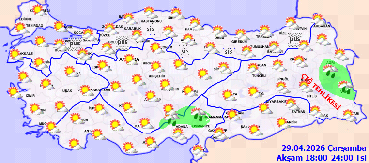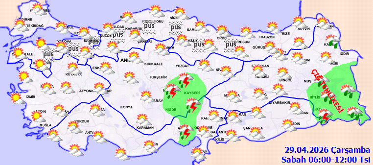 Günün ilerleyen saatlerinde Akdeniz, İç Anadolu ve Doğu Anadolu’nun birçok noktasında gök gürültülü sağanak yağışların görülmesi tahmin ediliyor. Yağış alması beklenen iller arasında; Adana, Osmaniye, Antalya’nın iç kesimleri, Mersin’in iç kesimleri, Isparta, Yozgat, Nevşehir, Kayseri, Niğde, Bingöl, Batman, Siirt ve Mardin yer alıyor. Kastamonu'nun güneyi ile Çorum ve Diyarbakır'ın belirli kesimlerinde de yerel sağanak geçişleri öngörülüyor.